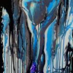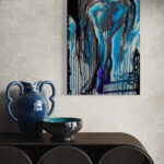 “Eclipsed Swan” portrays a ballerina bent forward, her form bathed in shades of deep blue and accented with black drips that cascade down the canvas. The fluid, shadowy lines create a sense of concealment, as if the dancer is caught between light and darkness. The pose evokes the elegance of a swan, yet the obscured details hint at vulnerability, transformation, and beauty hidden from full view.